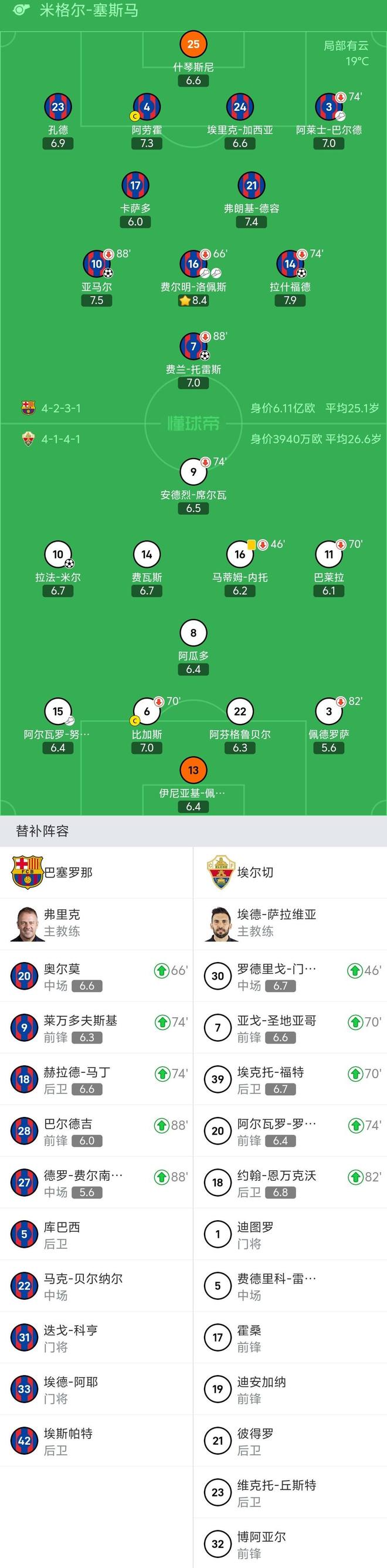 北京时间11月3日1:30,西甲第11轮继续进行,巴塞罗那坐镇主场迎战埃尔切,本场主裁判为米格尔-塞斯马。上半场,亚马尔与费兰三分钟内接连破门,随后拉法-米尔为埃尔切扳回一城。下半场,拉什福德爆射破门,拉法-米尔两度中框。最终,巴萨主场3-1击败埃尔切。